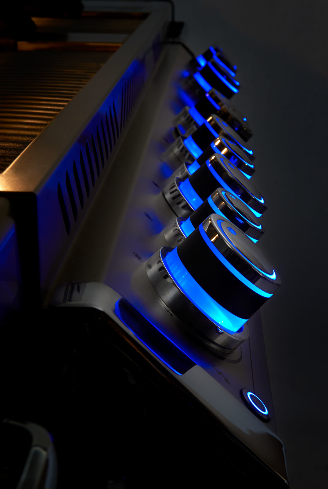 • NIGHT LIGHT™ Bedienelemente: Die blau hinterleuchteten Drehregler schalten auf Rot, wenn ein Brenner in Betrieb ist, und sorgen so für eine sichere und elegante Bedienung, auch bei Dunkelheit.