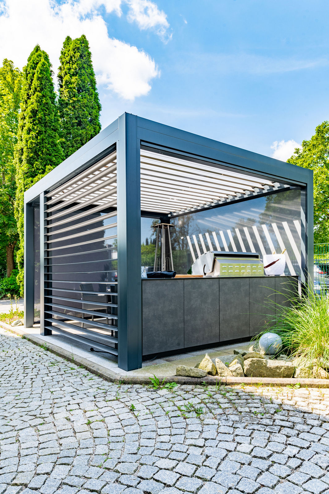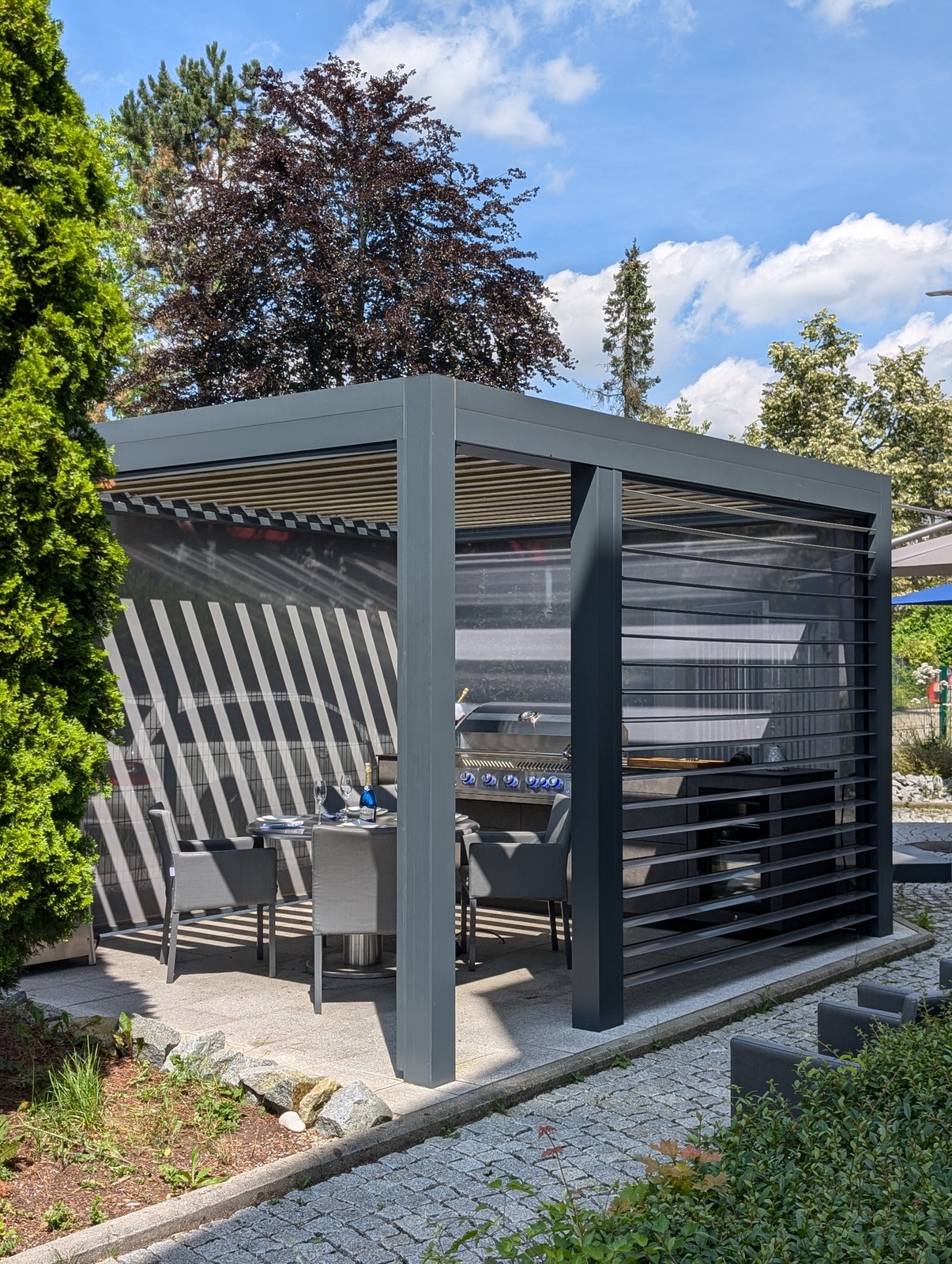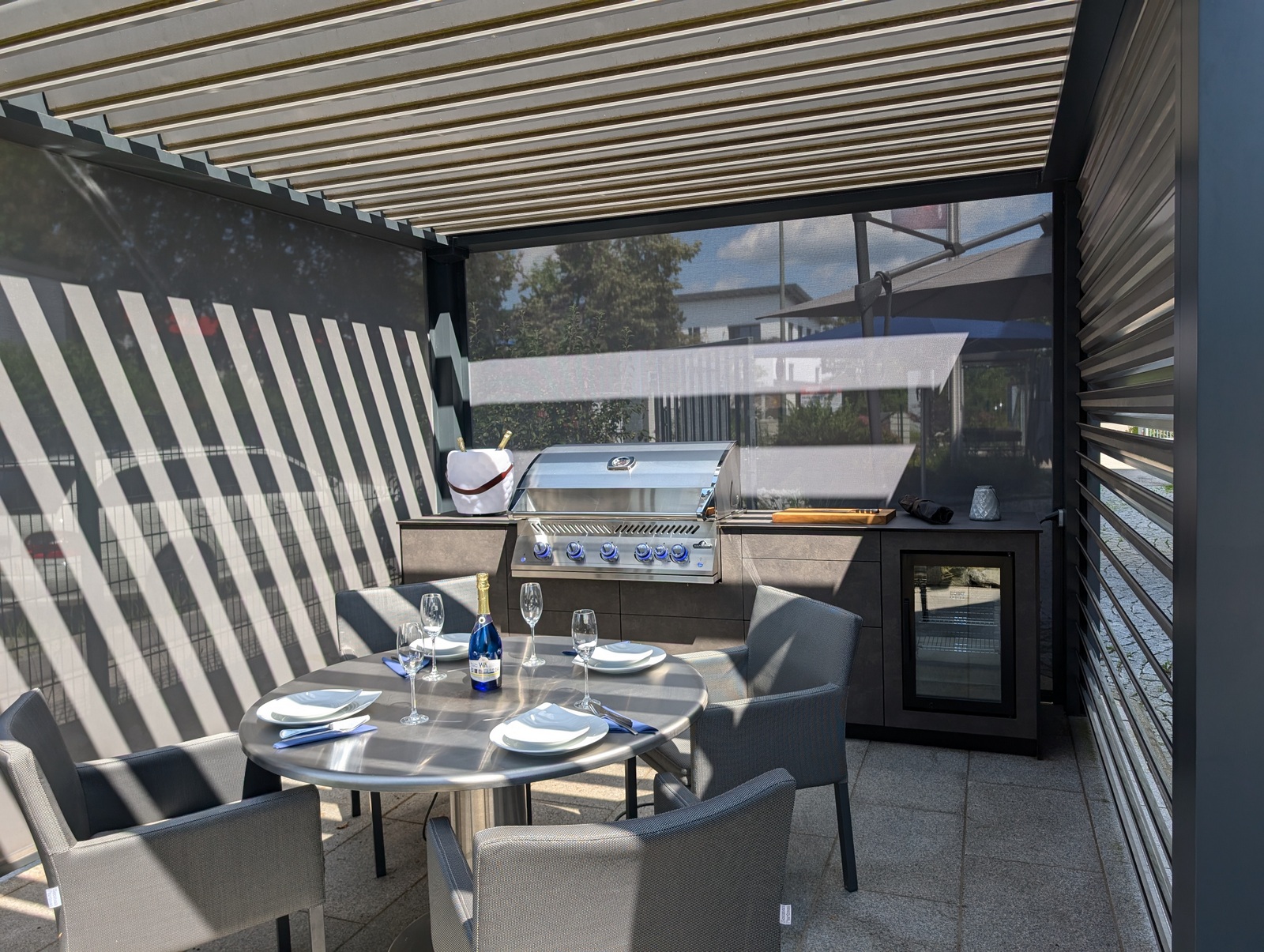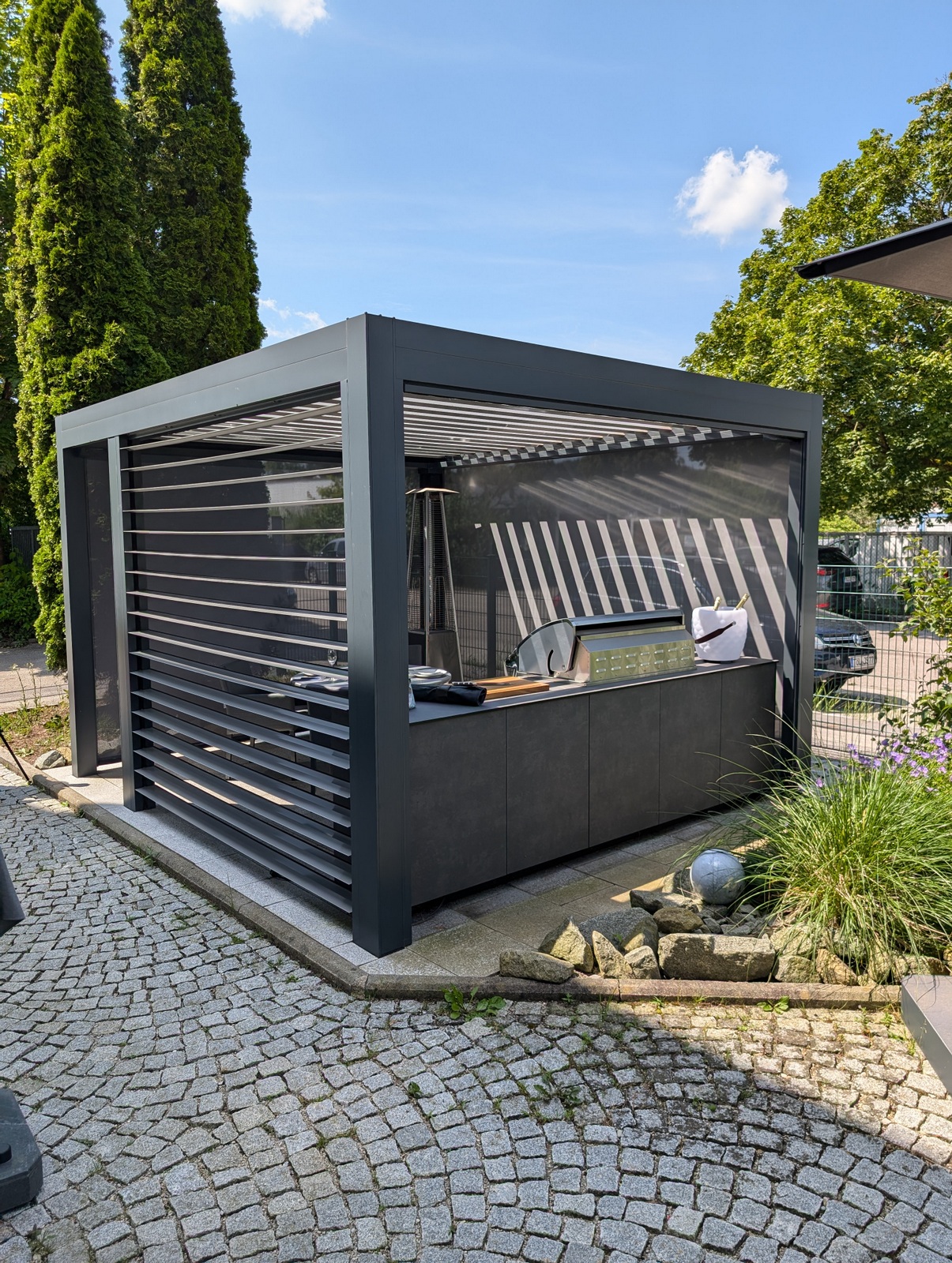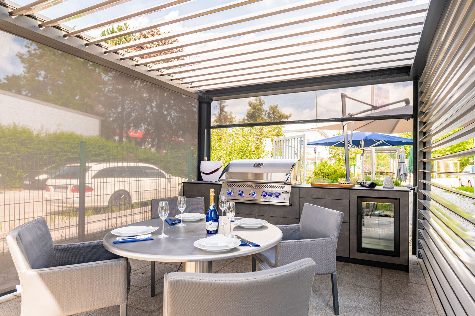 Die Kombination aus hochwertigem Lamellendach-Pavillon und modernster Küchenausstattung macht diese Outdoorküche zu einem echten Highlight. Das flexible Pavillon-System schafft eine angenehme Atmosphäre, unabhängig von Wetterbedingungen, und bietet gleichzeitig Schutz und Privatsphäre.
