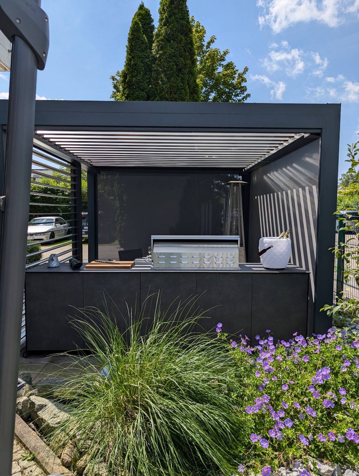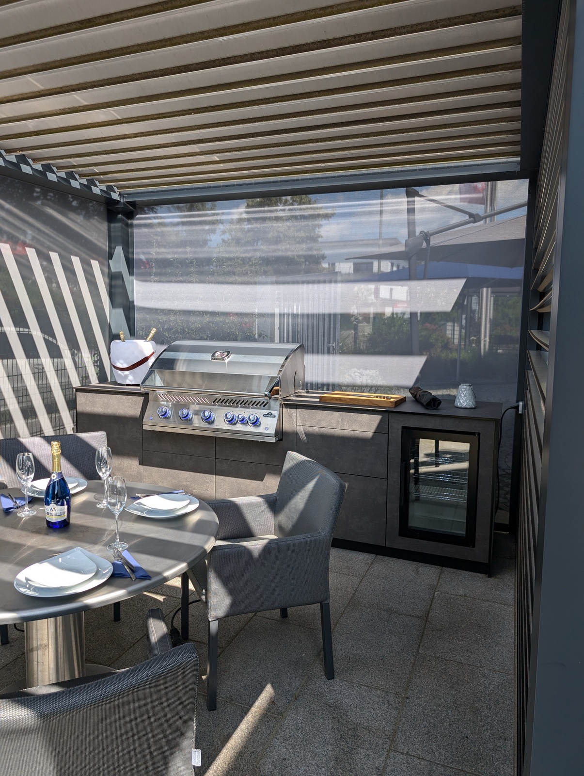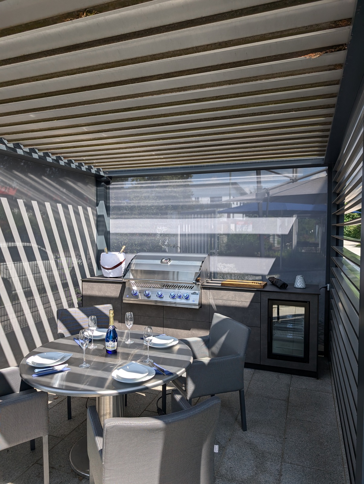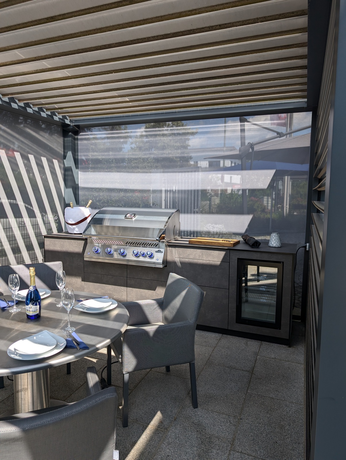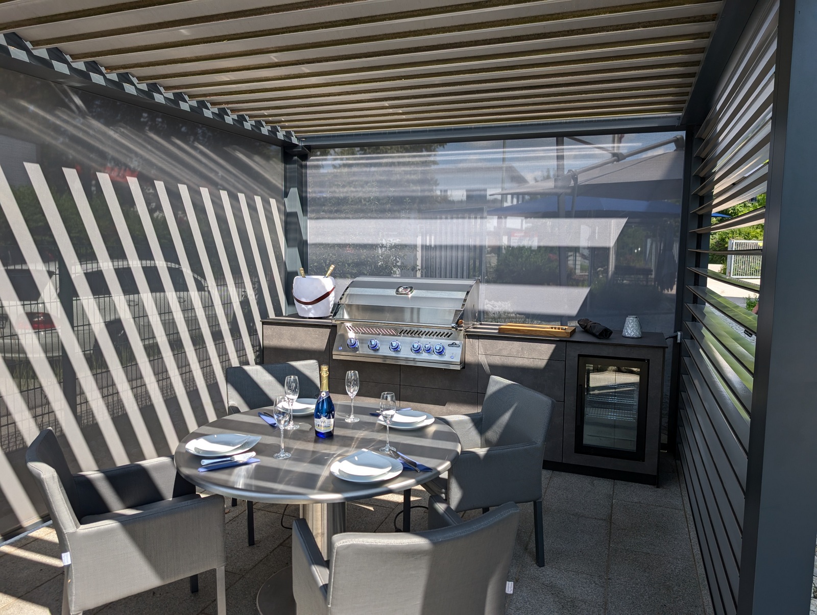Die Kombination aus hochwertigem Lamellendach-Pavillon und modernster Küchenausstattung macht diese Outdoorküche zu einem echten Highlight. Das flexible Pavillon-System schafft eine angenehme Atmosphäre, unabhängig von Wetterbedingungen, und bietet gleichzeitig Schutz und Privatsphäre.