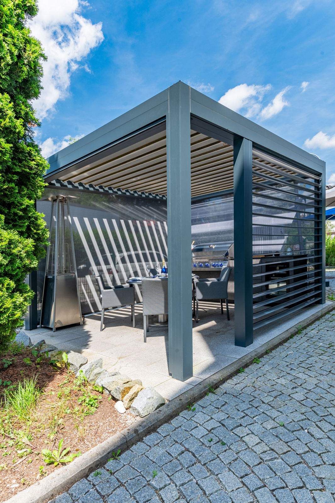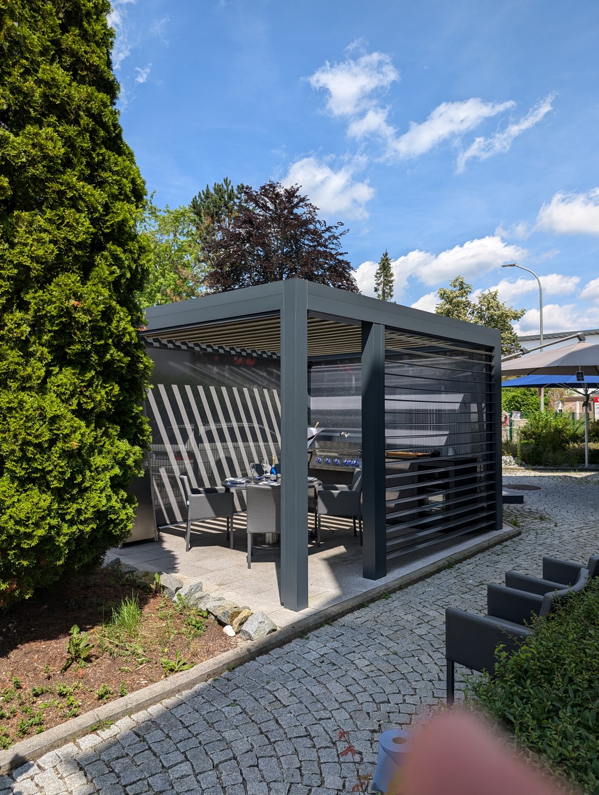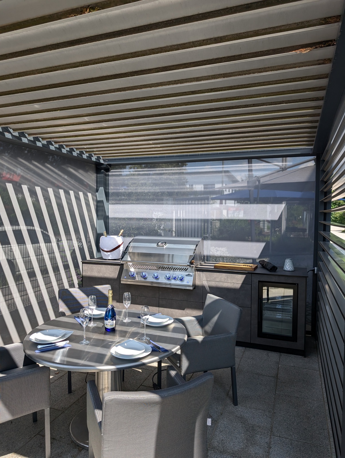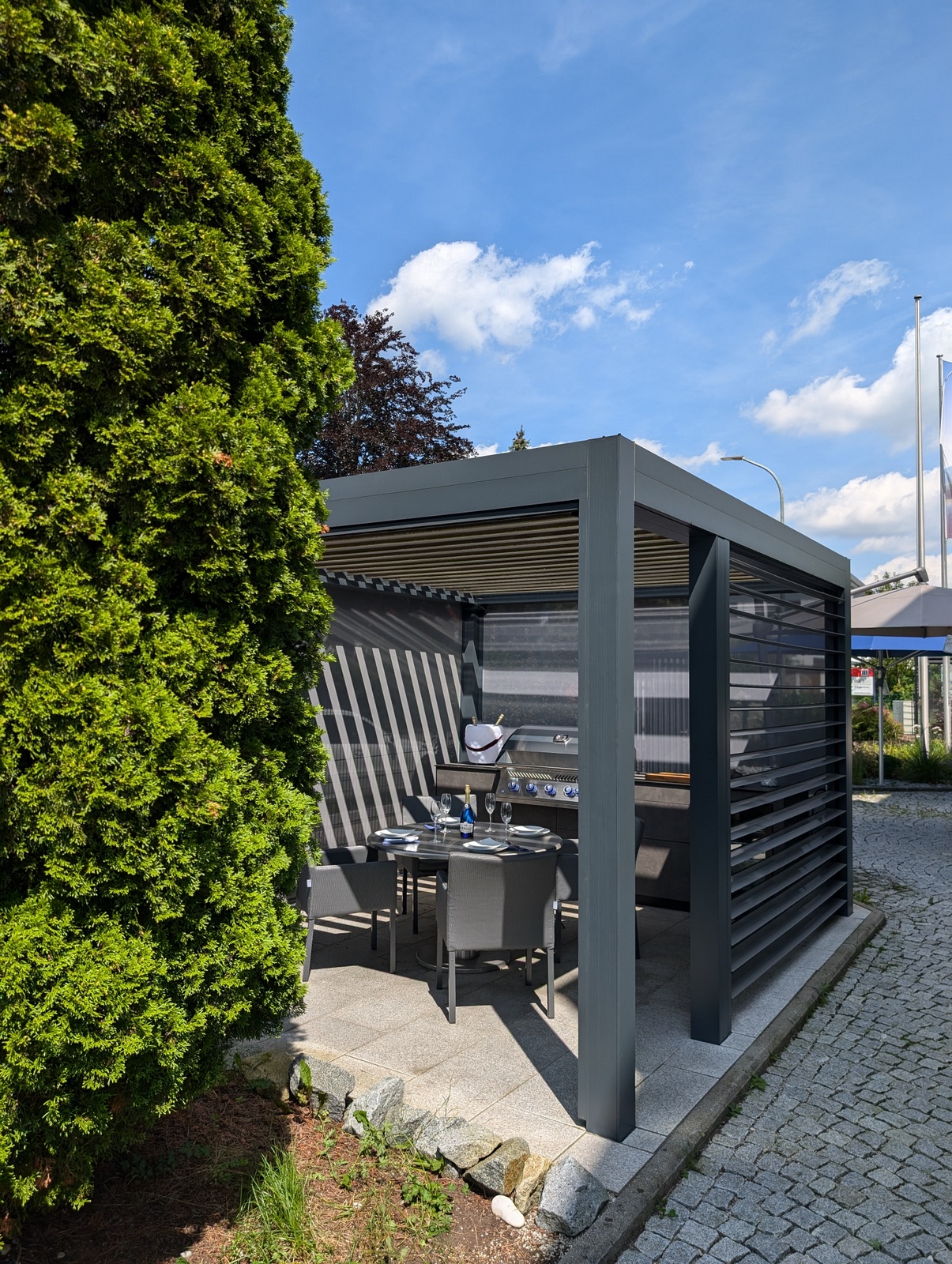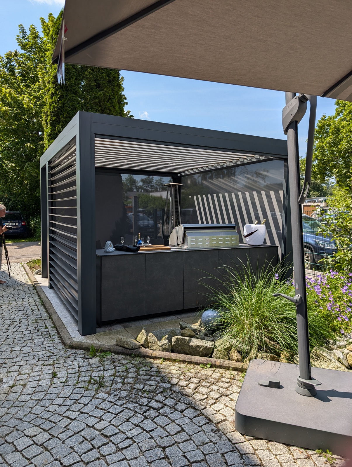 Die Kombination aus hochwertigem Lamellendach-Pavillon und modernster Küchenausstattung macht diese Outdoorküche zu einem echten Highlight. Das flexible Pavillon-System schafft eine angenehme Atmosphäre, unabhängig von Wetterbedingungen, und bietet gleichzeitig Schutz und Privatsphäre.