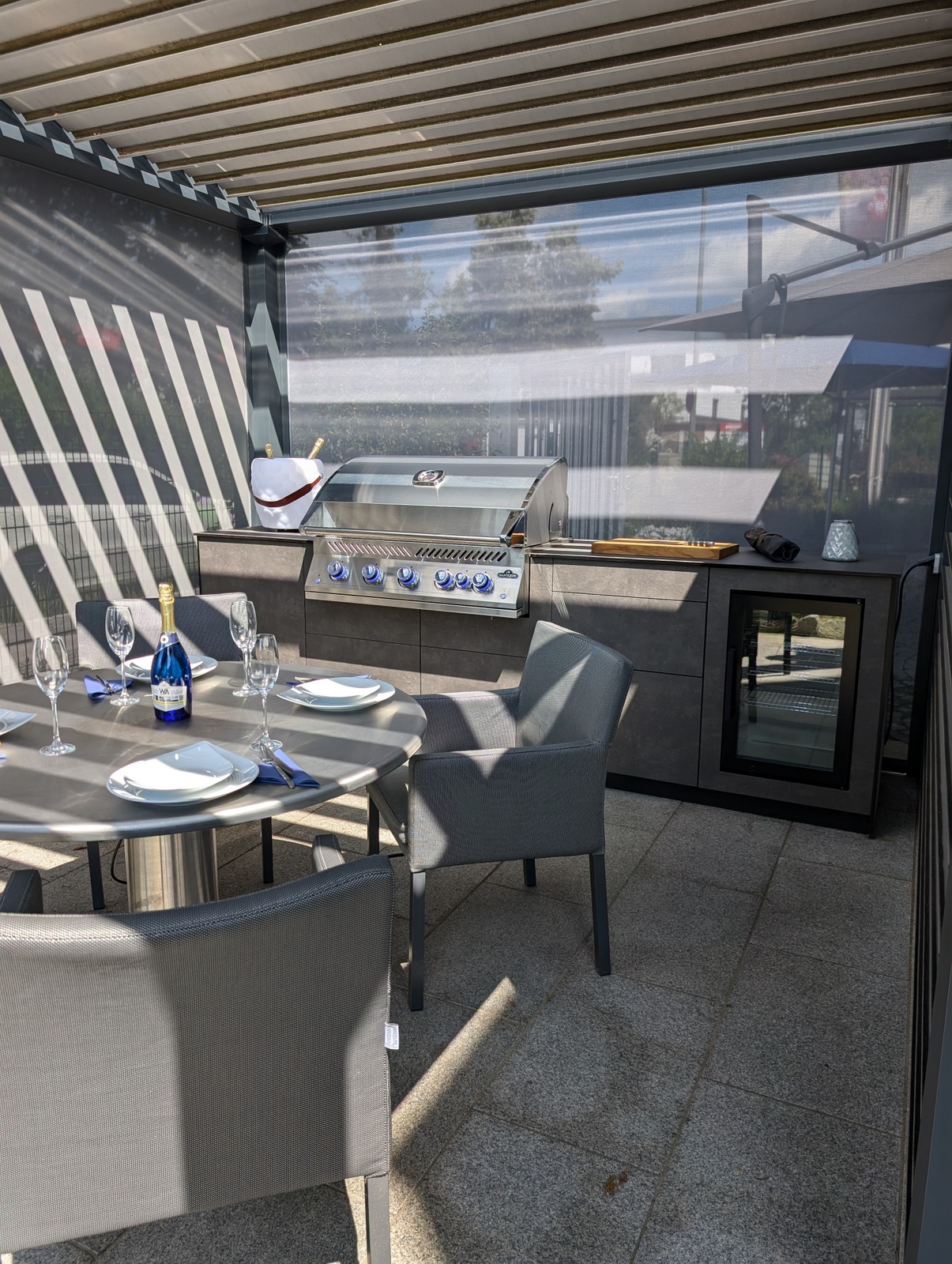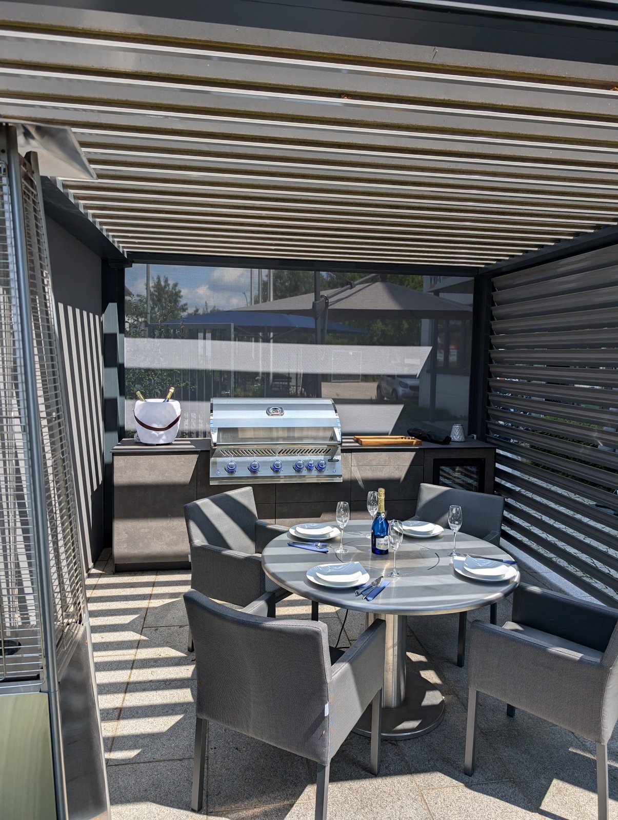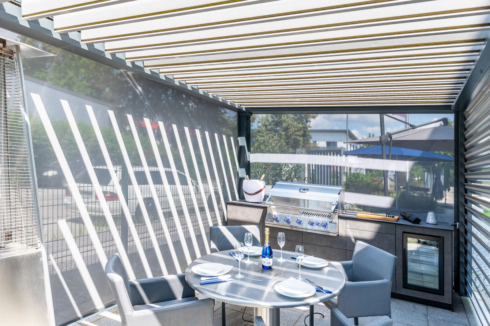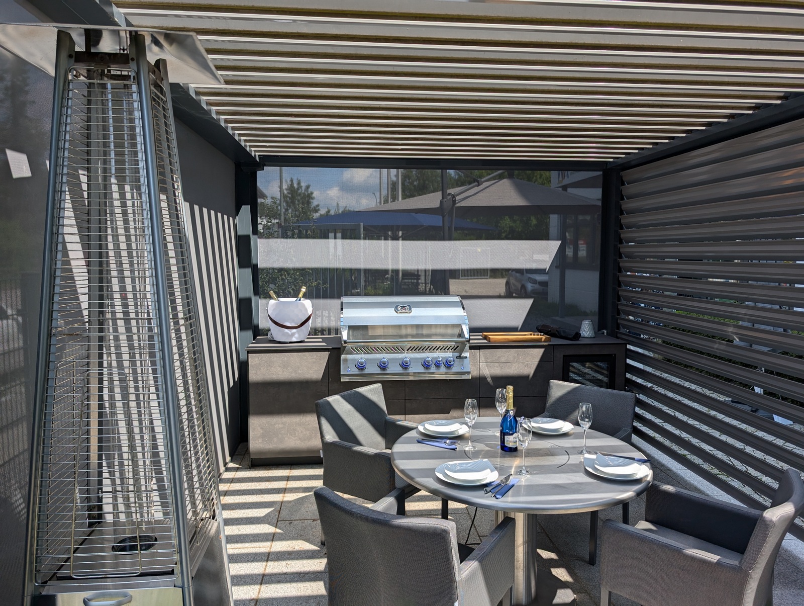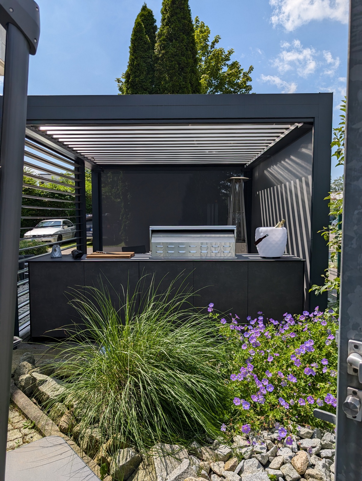 Die Kombination aus hochwertigem Lamellendach-Pavillon und modernster Küchenausstattung macht diese Outdoorküche zu einem echten Highlight. Das flexible Pavillon-System schafft eine angenehme Atmosphäre, unabhängig von Wetterbedingungen, und bietet gleichzeitig Schutz und Privatsphäre.