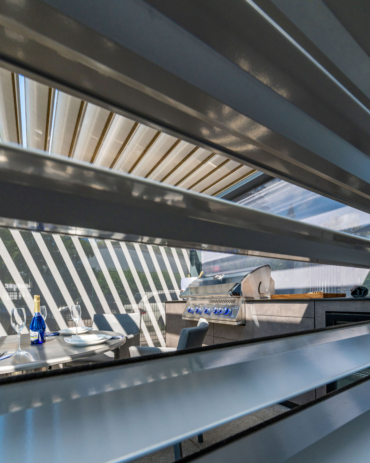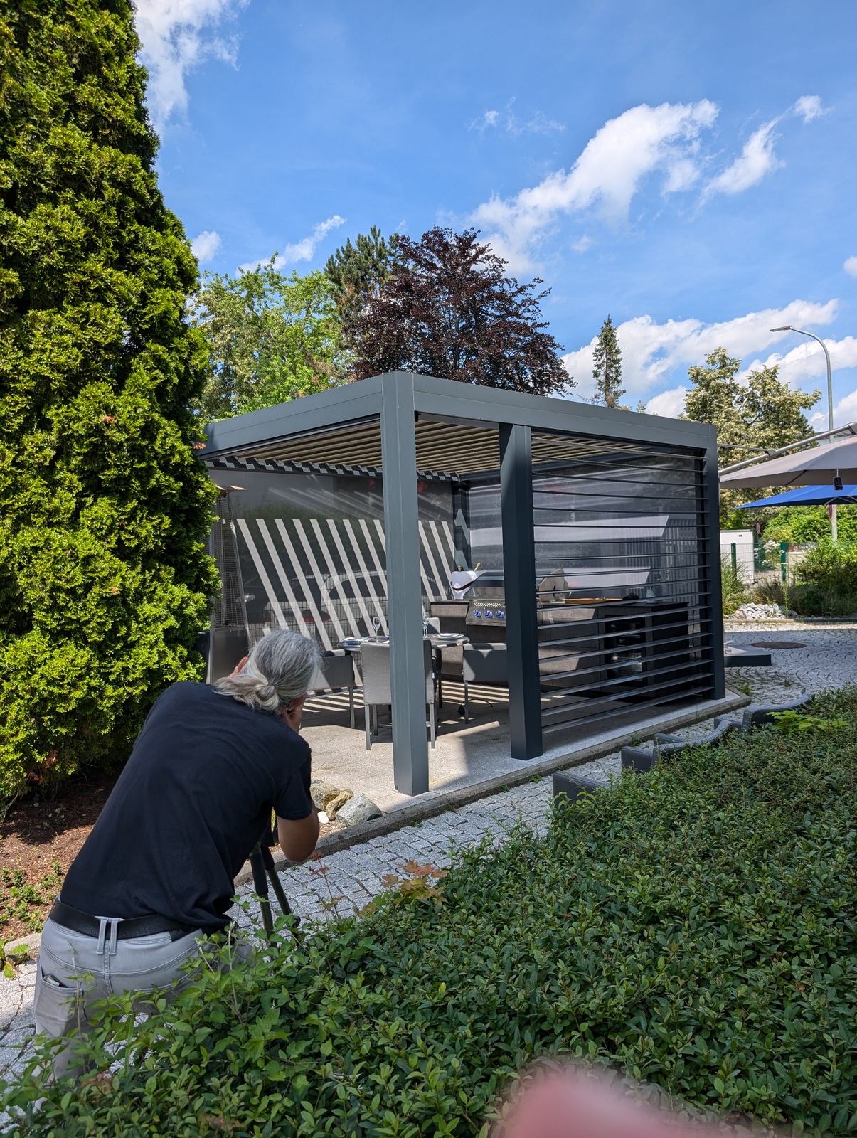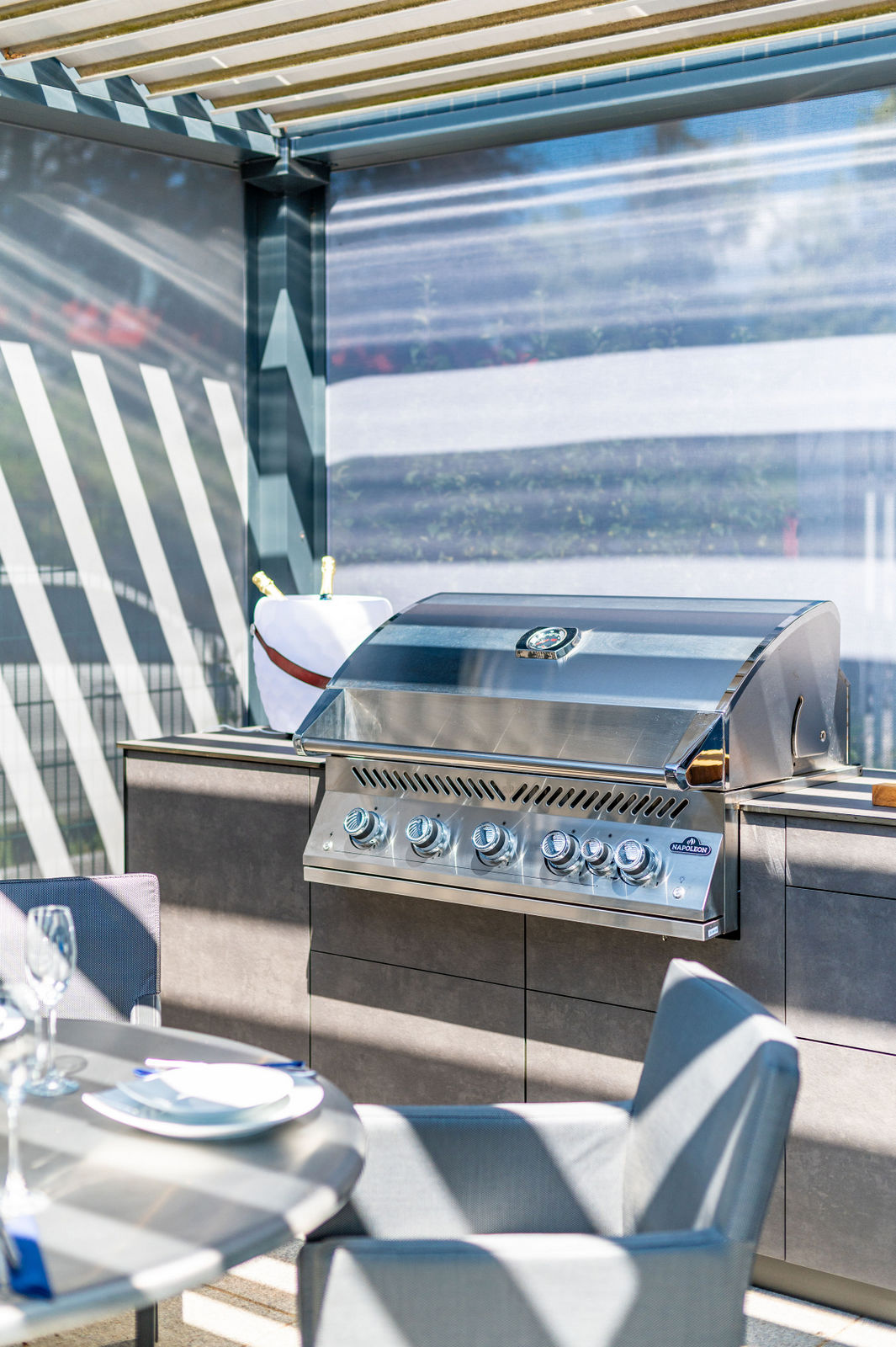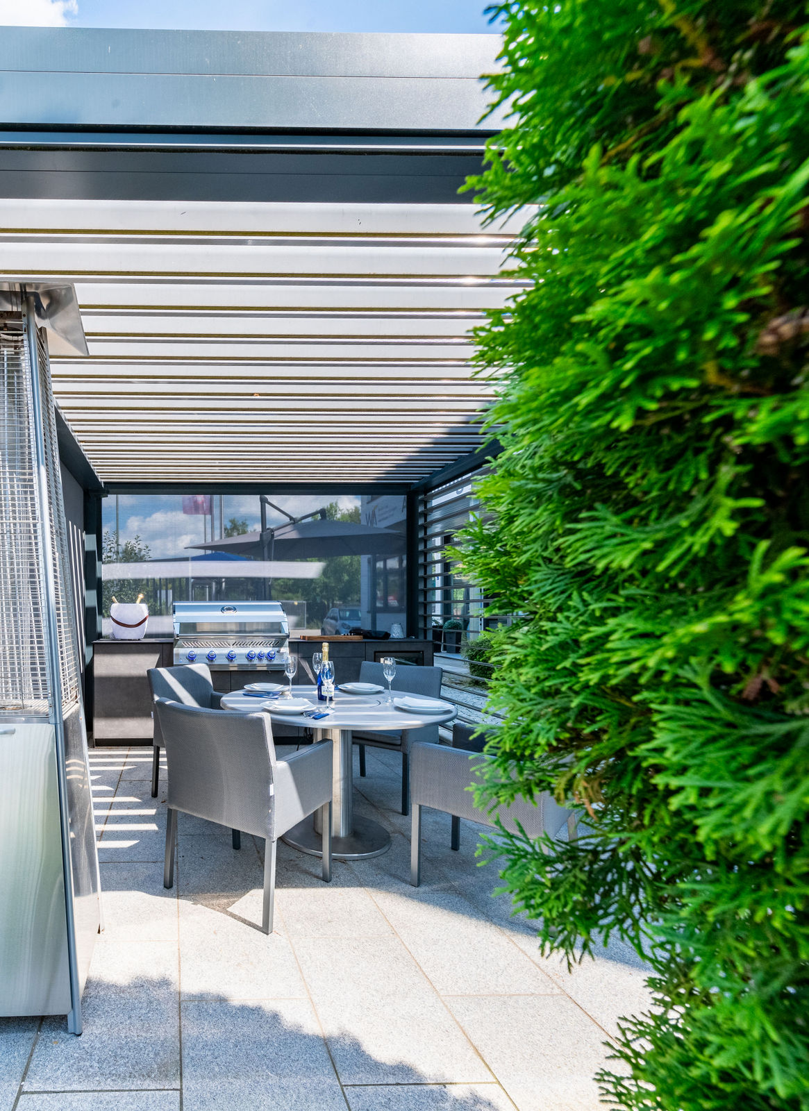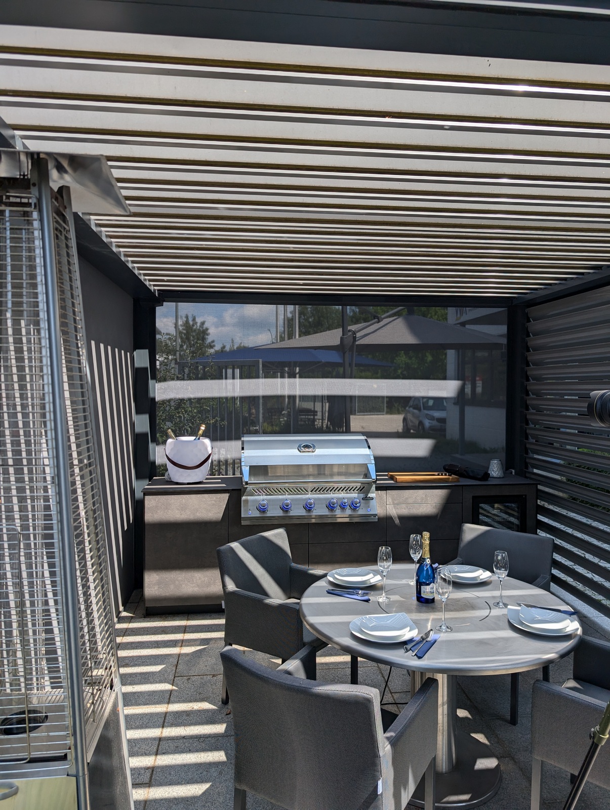 Die Kombination aus hochwertigem Lamellendach-Pavillon und modernster Küchenausstattung macht diese Outdoorküche zu einem echten Highlight. Das flexible Pavillon-System schafft eine angenehme Atmosphäre, unabhängig von Wetterbedingungen, und bietet gleichzeitig Schutz und Privatsphäre.