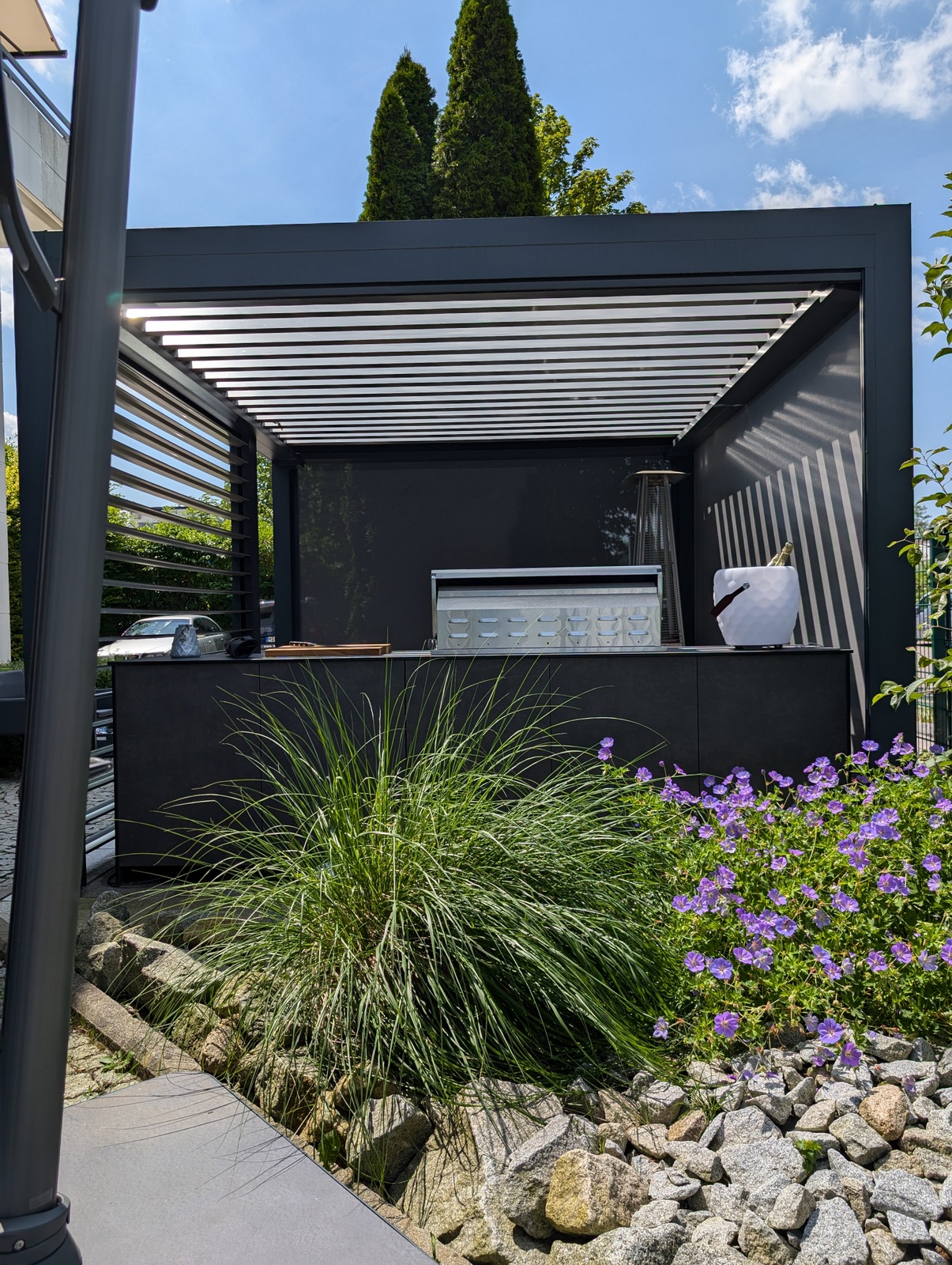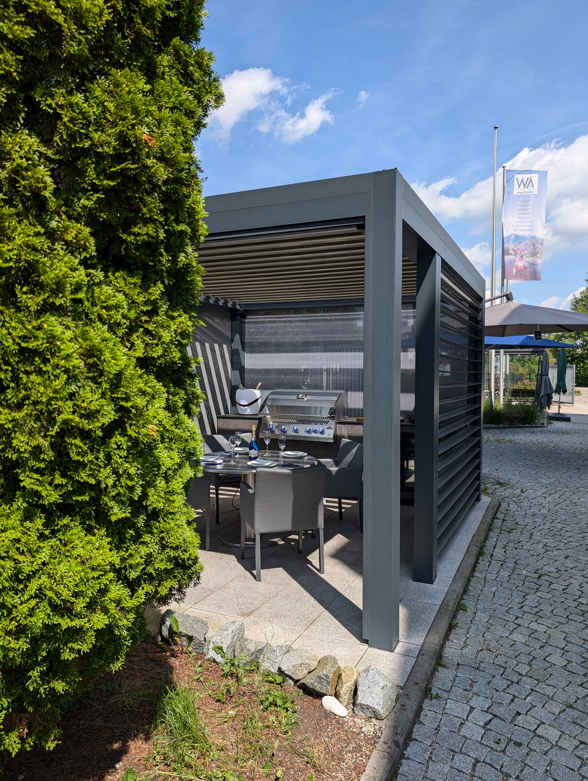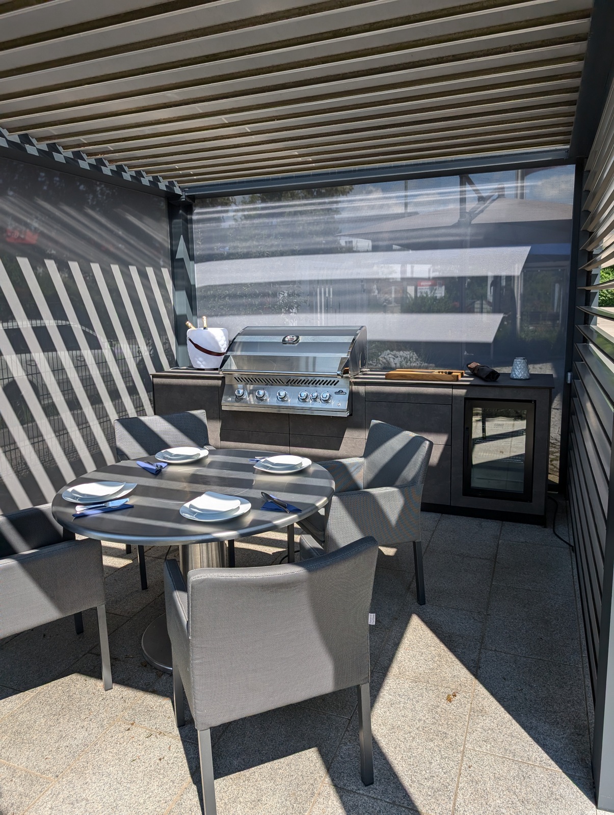 Bei unserem Partner WSA Smart Home GmbH entstand eine elegante Outdoorküche, die Design, Funktionalität und modernste Technologie vereint. Unter einem hochwertigen Lamellendach-Pavillon, der sich vollständig öffnen und auf allen Seiten abdunkeln lässt, bietet diese Küche nicht nur Schutz vor Sonne und Wetter, sondern auch eine stilvolle Umgebung für kulinarische Highlights.