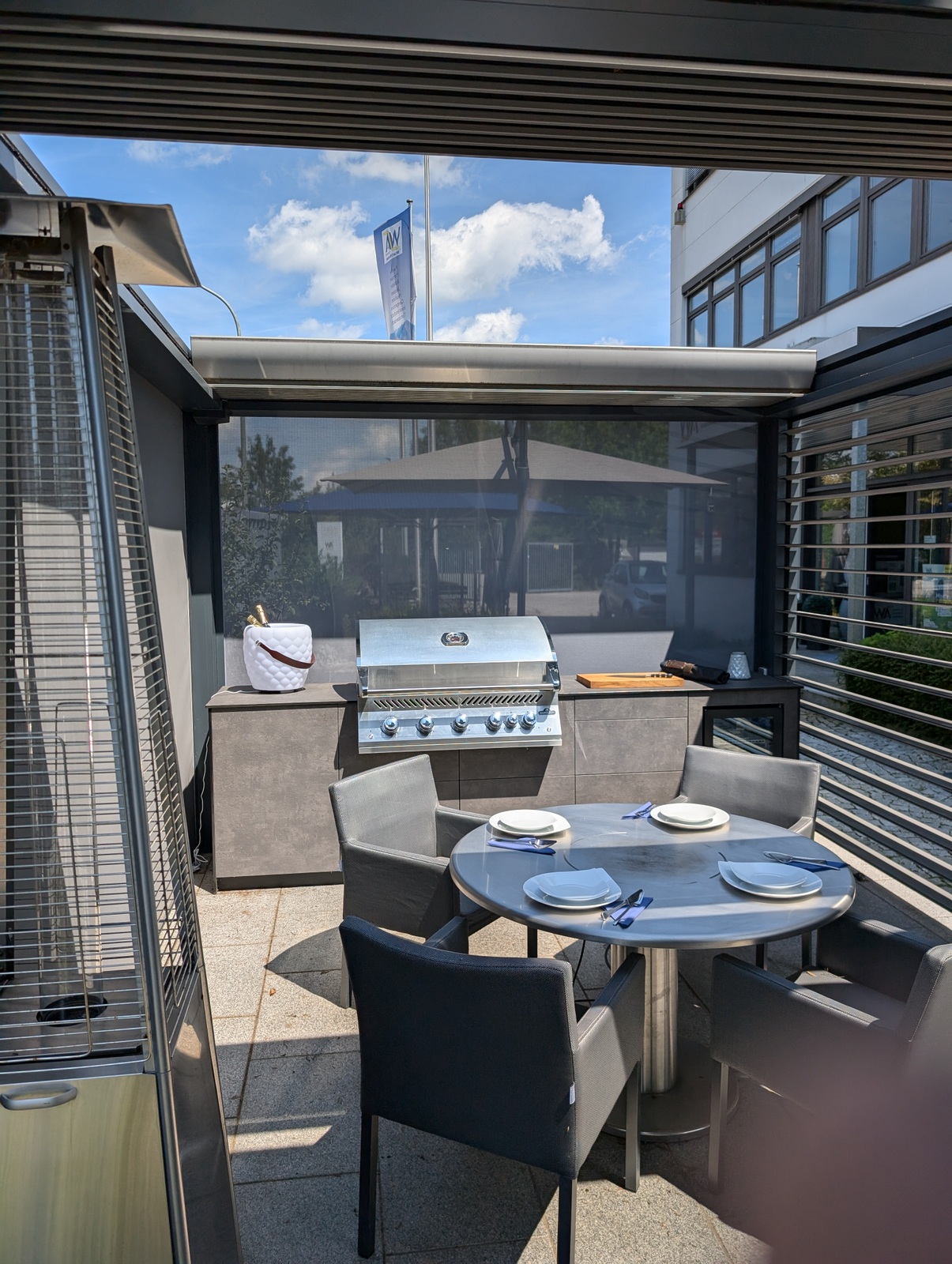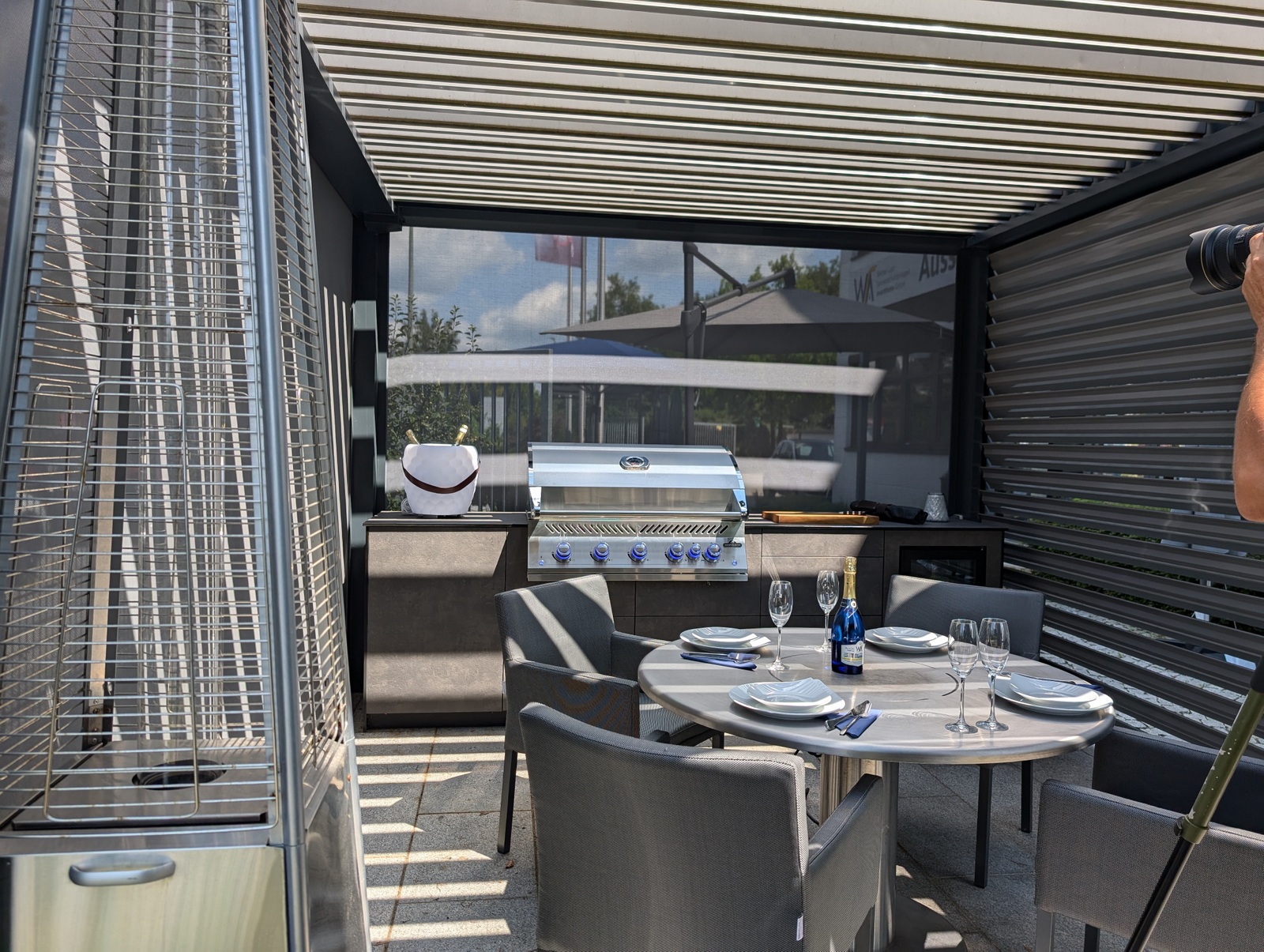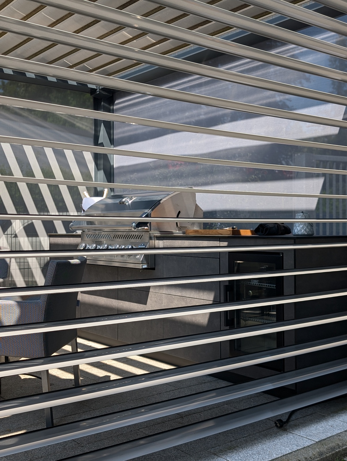 Bei unserem Partner WSA Smart Home GmbH entstand eine elegante Outdoorküche, die Design, Funktionalität und modernste Technologie vereint. Unter einem hochwertigen Lamellendach-Pavillon, der sich vollständig öffnen und auf allen Seiten abdunkeln lässt, bietet diese Küche nicht nur Schutz vor Sonne und Wetter, sondern auch eine stilvolle Umgebung für kulinarische Highlights.