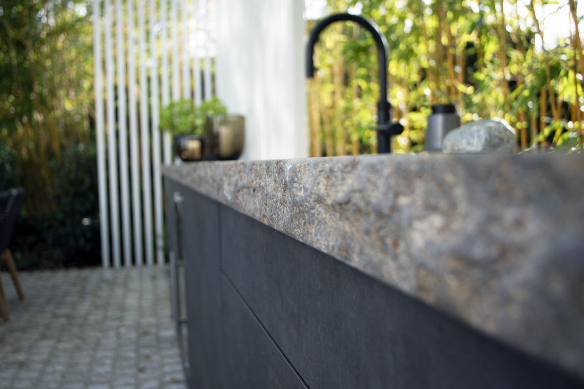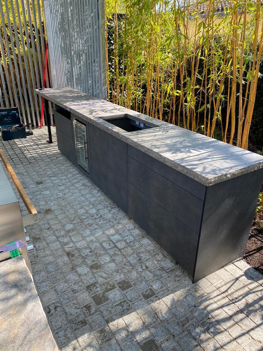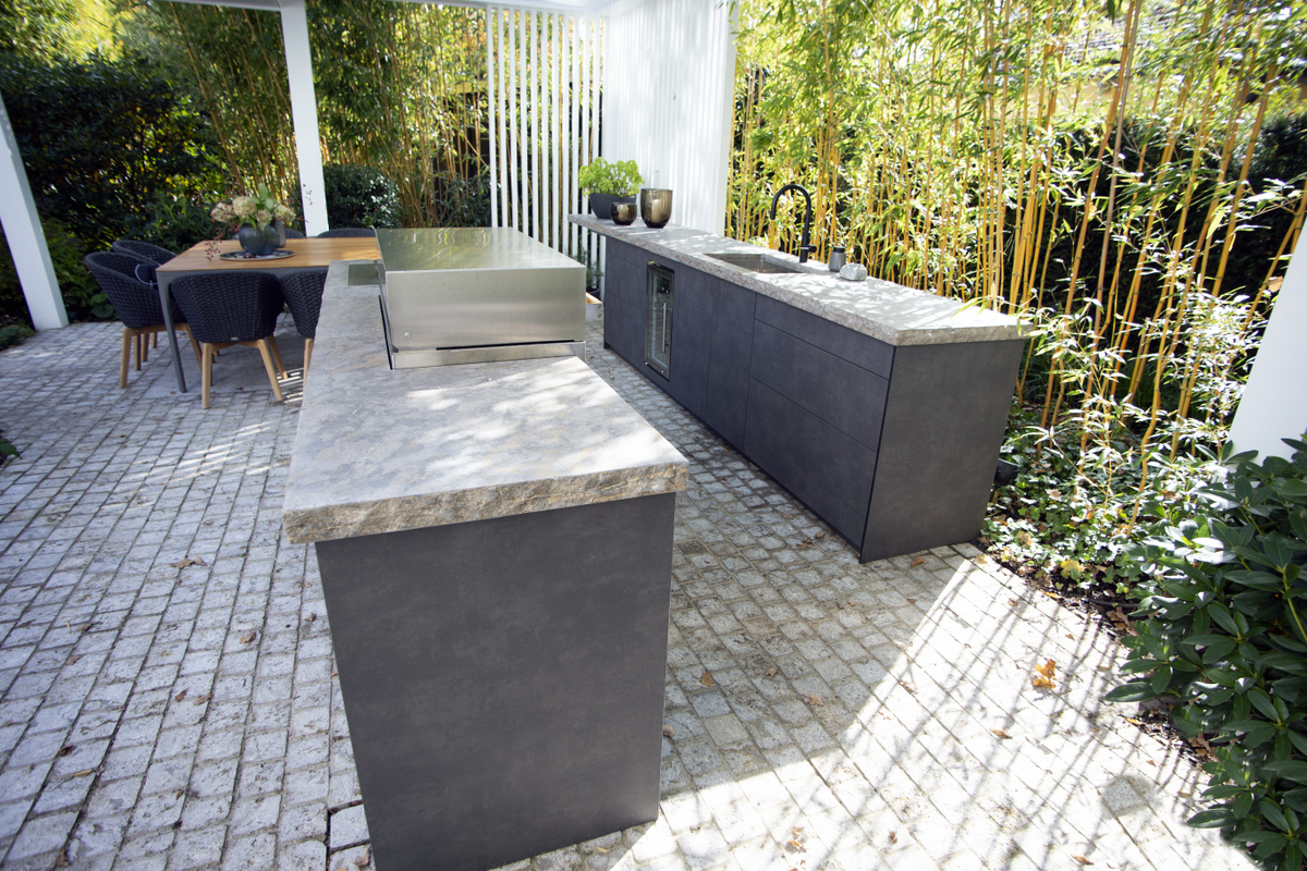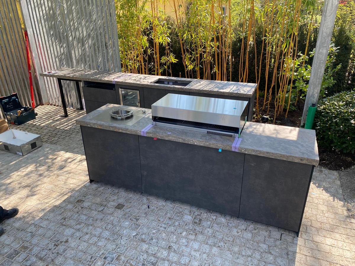 Die Küchenfronten im Dekor Dark Grey harmonieren perfekt mit der edlen Muschelkalk-Arbeitsplatte. Der weiße Pavillon bietet nicht nur Schutz vor Witterung, sondern schafft eine elegante Überdachung, die das Gesamtbild abrundet. Die zwei gegenüberliegenden Küchenzeilen bieten großzügige Arbeits- und Stauraumoptionen, ergänzt durch eine freistehende Arbeitsfläche.