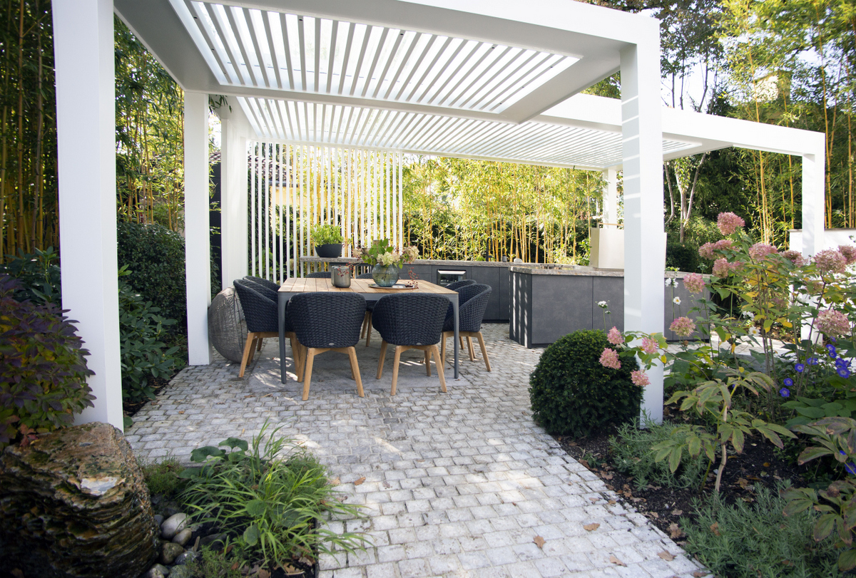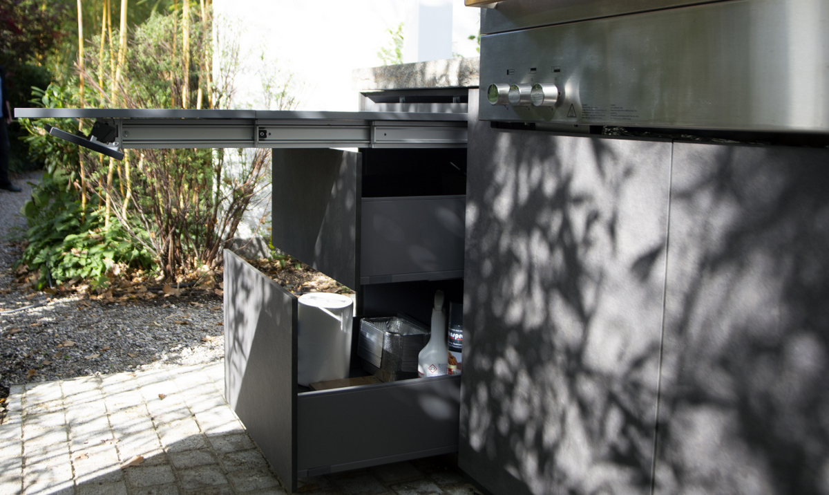Durch den Pavillon bleiben Ihre Gäste und die Küche vor Sonne und Regen geschützt, sodass das Kochen bei jedem Wetter zum Vergnügen wird.