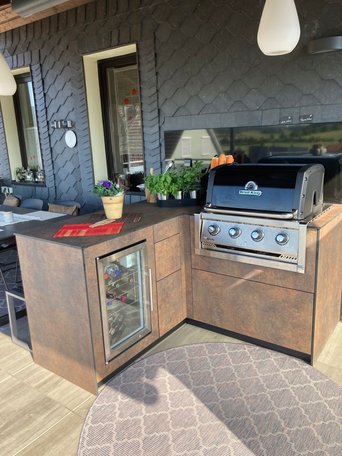 In Kooperation mit dem RH Küchenstudio entstand diese elegante L-förmige Outdoorküche im edlen Bronze-Dekor, die Funktionalität und Stil auf kleinem Raum vereint. Diese Küche ist ein perfektes Beispiel für cleveres Design und innovative Lösungen im Outdoor-Bereich.