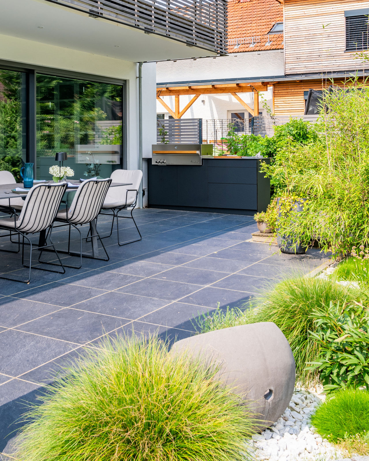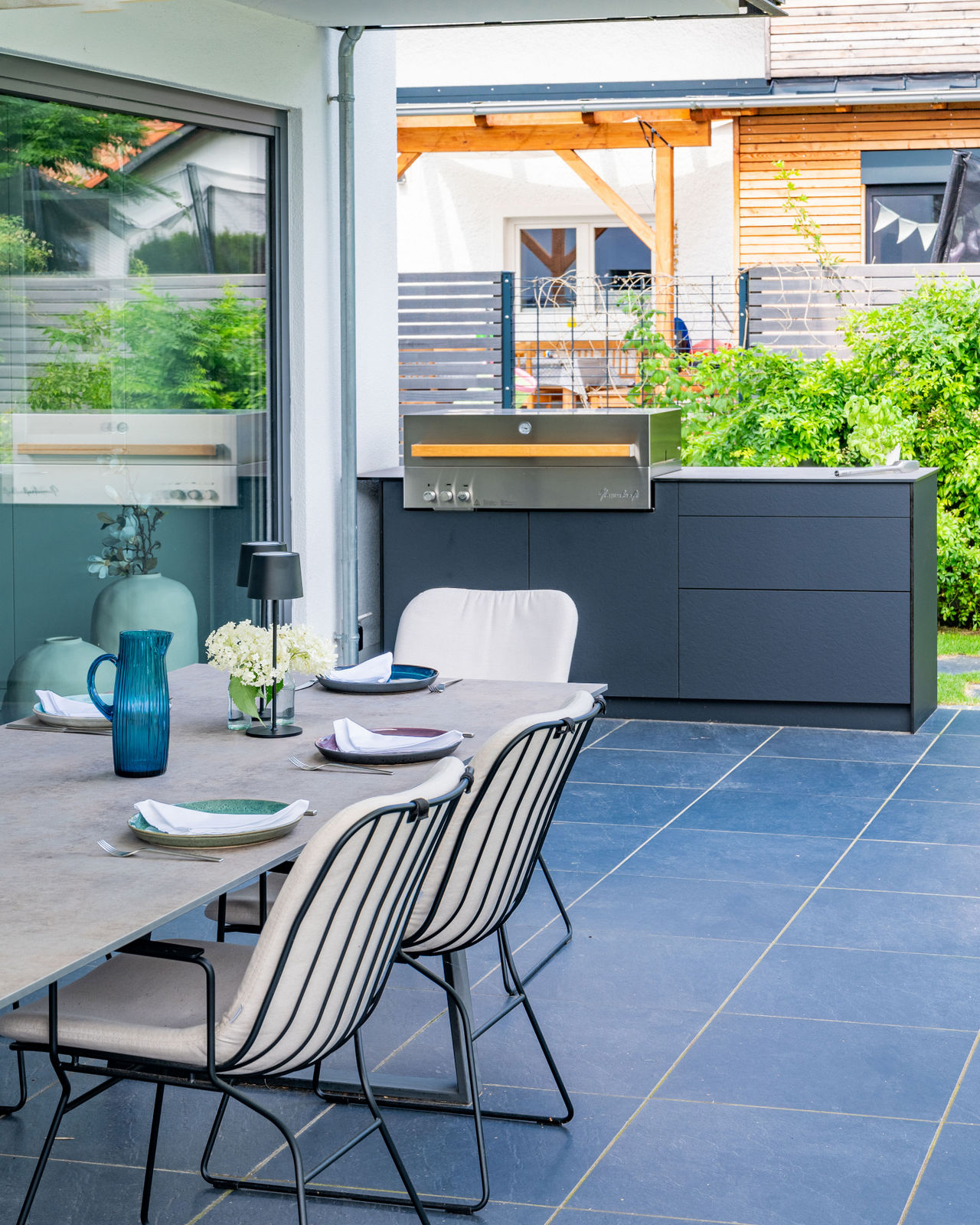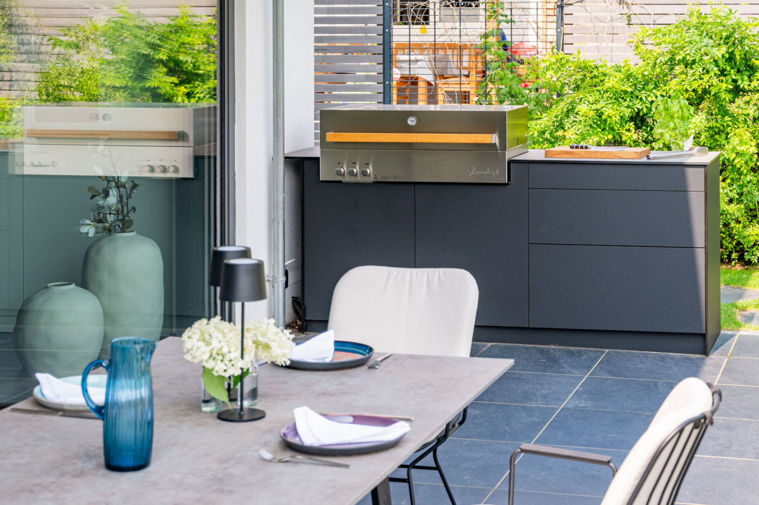 Die Outdoorküche in Wolfratshausen vereint Design und Funktionalität. Sie bietet nicht nur eine luxuriöse Kochumgebung, sondern auch einladende Sitzmöglichkeiten für gemeinsame Abende. Der Flammkraft Block D macht diese Küche zum Traum eines jeden Grillmeisters, während der großzügige Tisch ein Ort für kulinarische Highlights und Gespräche ist.