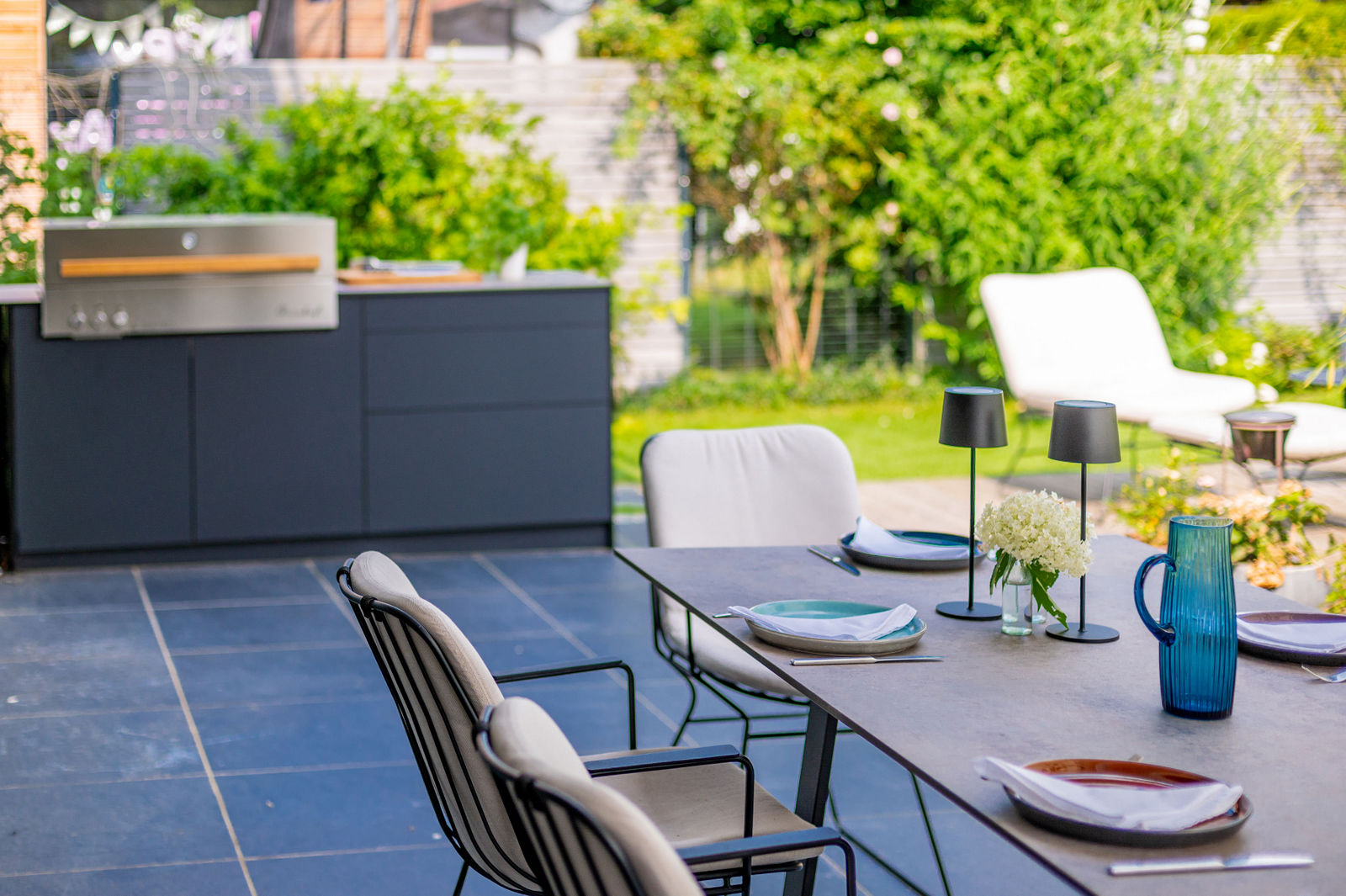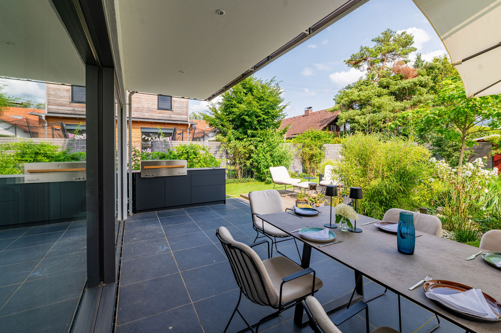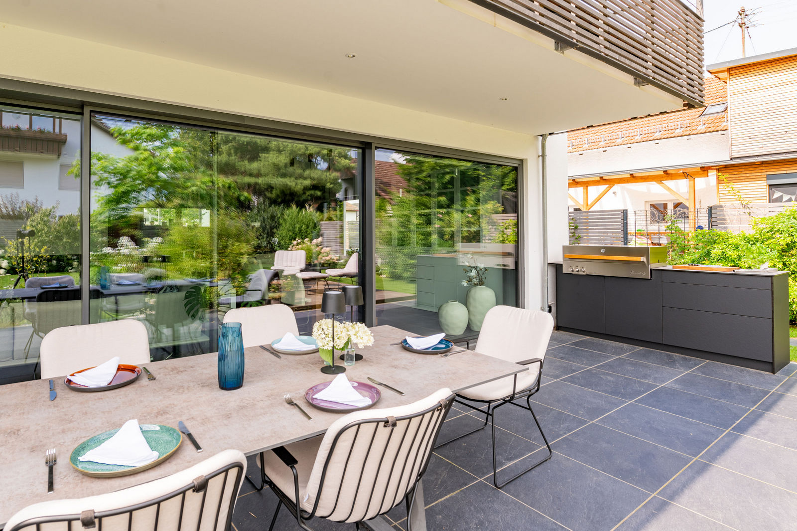 Die Outdoorküche in Wolfratshausen vereint Design und Funktionalität. Sie bietet nicht nur eine luxuriöse Kochumgebung, sondern auch einladende Sitzmöglichkeiten für gemeinsame Abende. Der Flammkraft Block D macht diese Küche zum Traum eines jeden Grillmeisters, während der großzügige Tisch ein Ort für kulinarische Highlights und Gespräche ist.