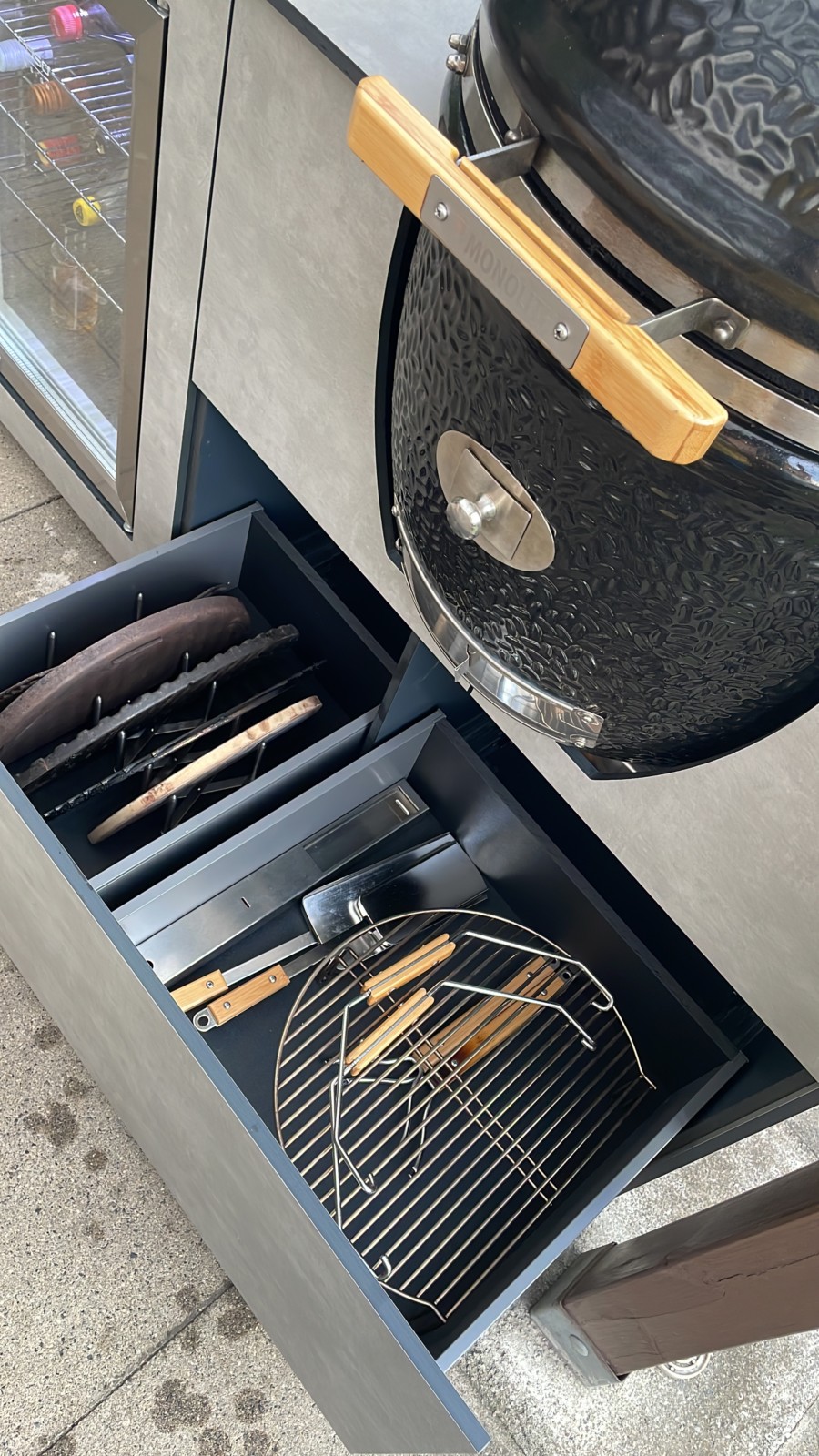OUT4KITCHEN bietet zahlreiche Optionen: Besteckeinsätze, Gastronorm-Schubladen, Spezialauszüge, Gassteckdosen für Pizzaöfen oder Beefer, Induktionskochfelder, Zapfanlagen, Outdoor-Kühlschränke, Spülbecken, Steckdosen, Beleuchtung und mehr. Alles wird auf Wunsch fest integriert – funktional und stilvoll.